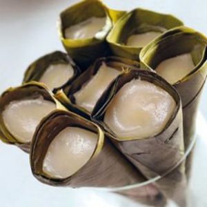 Tepung beras dan sedikit garam kemudian dicampurkan dan diberi gula merah yang sudah dicairkan. Masukkan adonan tersebut ke dalam cetakan yang terbuat dari daun pisang yang dibentuk menyerupai kerucut.