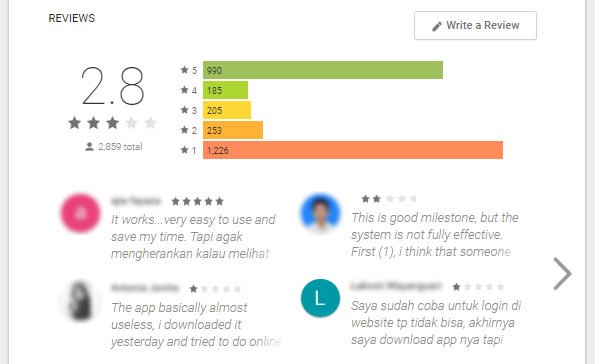 Keterbatasan inilah yang seringkali membuat aplikasi mobile yang satu ini cepat mendapat negative review. Pas penulisan artikel ini, review yang didapat bisa dibilang sangat kurang (2.8 dari 5.0). Banyak review negatif yang seringkali berkisar perihal respon aplikasi yang hanya “menolak” saja.